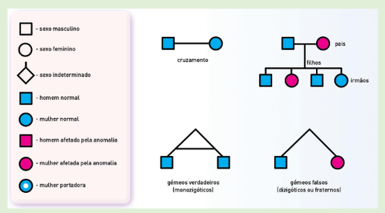 Podemos usar uma árvore genealógica para estudar a transmissão de características ao logo de várias gerações. Estes esquemas têm uma grande importância, pois podemos utilizar para estudar características que se tratem de anomalias, assim conseguiremos calcular o risco de transmissão dessa anomalia para as gerações futuras.